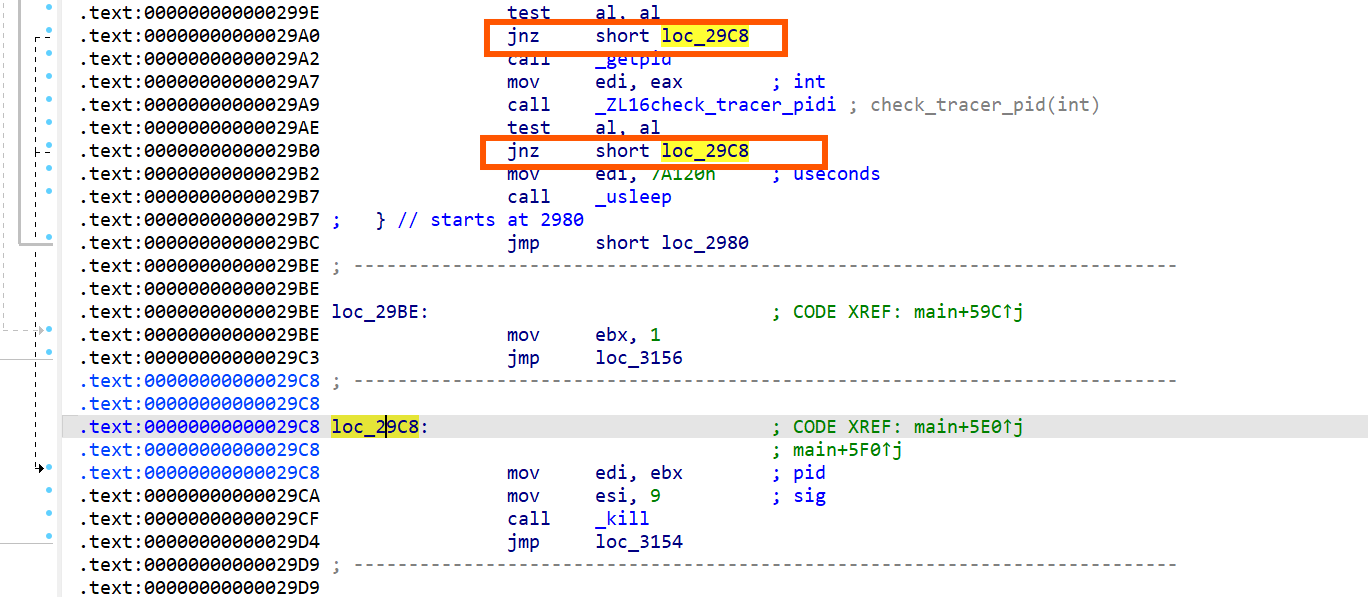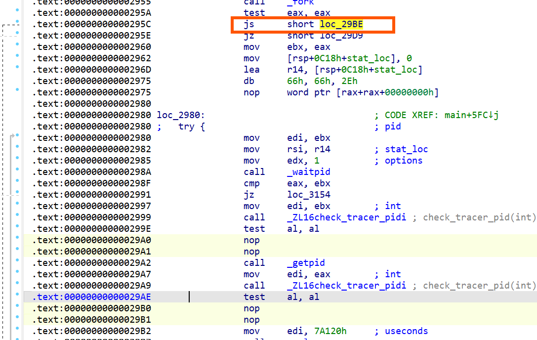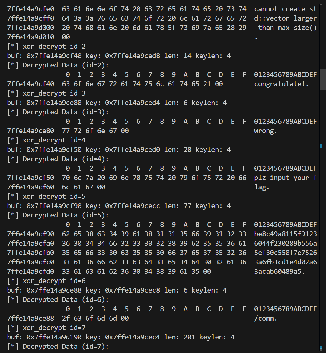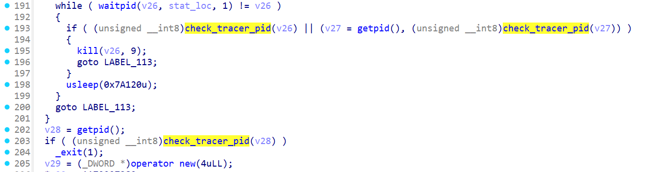 v118 = xmmword_427E; v117 = xmmword_426E; *(_OWORD *)v116 = xmmword_425E; v119 = 99; v99 = 233665123; sub_3B00(v116, &v99, 49LL, 4LL); qmemcpy(v108, "9J<T(D&F6D&V{%", 14); v98 = 861021530; sub_3B00(v108, &v98, 14LL, 4LL); v84 = 17386; v83 = 142619130; v97 = 1726956429; sub_3B00(&v83, &v97, 6LL, 4LL); v109 = xmmword_4236; v110 = 527534212; v96 = 521595368; sub_3B00(&v109, &v96, 20LL, 4LL); *(_OWORD *)&v115[13] = *(__int128 *)((char *)&xmmword_4219 + 13); *(_OWORD *)v115 = xmmword_4219; v114 = xmmword_4209; v113 = xmmword_41F9; v112 = xmmword_41E9; v95 = 1303455736; sub_3B00(&v112, &v95, 77LL, 4LL); v86 = 25263; v85 = 918487533; v94 = 1540383426; sub_3B00(&v85, &v94, 6LL, 4LL); memcpy(dest, &unk_4100, 0xC9uLL); v93 = 1350490027; sub_3B00(dest, &v93, 201LL, 4LL); *(_QWORD *)&v111[13] = 0xEC063B3D9C123462LL; *(__m128i *)v111 = _mm_loadu_si128(&xmmword_40B2); v92 = 1649760492; sub_3B00(v111, &v92, 21LL, 4LL); *(_DWORD *)&v87[3] = 2064426333; *(_DWORD *)v87 = 1560892393; v91 = 846930886; sub_3B00(v87, &v91, 7LL, 4LL); v3 = getpid(); v4 = 1; if ( (unsigned __int8)check_tracer_pid(v3) ) return v4; v5 = getppid(); v6 = -v5; if ( v5 > 0 ) v6 = v5; v7 = 1; if ( v6 >= 0xA ) { v7 = 4; v8 = v6; while ( 1 ) { if ( v8 <= 0x63 ) { v7 -= 2; goto LABEL_13; } if ( v8 <= 0x3E7 ) break; if ( v8 < 0x2710 ) goto LABEL_13; v7 += 4; v9 = v8 <= 0x1869F; v8 /= 0x2710u; if ( v9 ) { v7 -= 3; goto LABEL_13; } } --v7; } LABEL_13: v10 = (unsigned int)v5 >> 31; s2 = v90; std::string::_M_construct(&s2, v7 + ((unsigned int)v5 >> 31), 45LL); v11 = (char *)s2 + v10; if ( v6 < 0x64 ) { v13 = v6; if ( v6 >= 0xA ) { LABEL_17: v11[1] = dest[2 * (v13 & 0x7FFFFFFF) + 1]; v15 = dest[2 * v13]; goto LABEL_20; } } else { v12 = v7 - 2; do { v13 = v6 / 0x64; v14 = v6 % 0x64; v11[v12 + 1] = dest[2 * v14 + 1]; v11[v12] = dest[2 * v14]; v12 -= 2; v9 = v6 <= 0x270F; v6 /= 0x64u; } while ( !v9 ); if ( v13 >= 0xA ) goto LABEL_17; } v15 = v13 + 48; LABEL_20: *v11 = v15; v16 = std::string::_M_replace(&s2, 0LL, 0LL, v87, 6LL); v17 = v16; *(_QWORD *)stat_loc = v132; v18 = (_QWORD *)(v16 + 16); if ( *(_QWORD *)v16 == v16 + 16 ) { memcpy(v132, *(const void **)v16, *(_QWORD *)(v16 + 8) + 1LL); } else { *(_QWORD *)stat_loc = *(_QWORD *)v16; v132[0] = *v18; } *(_QWORD *)&stat_loc[2] = *(_QWORD *)(v17 + 8); *(_QWORD *)v17 = v18; *(_QWORD *)(v17 + 8) = 0LL; *(_BYTE *)(v17 + 16) = 0; if ( (unsigned __int64)(*(_QWORD *)&stat_loc[2] - 0x3FFFFFFFFFFFFFFBLL) <= 4 ) std::__throw_length_error(v111); v19 = std::string::_M_append(stat_loc, &v85, 5LL); v20 = v19; v120 = v122; v21 = (_QWORD *)(v19 + 16); if ( *(_QWORD *)v19 == v19 + 16 ) { memcpy(v122, *(const void **)v19, *(_QWORD *)(v19 + 8) + 1LL); } else { v120 = *(void **)v19; v122[0] = *v21; } v121 = *(char **)(v20 + 8); *(_QWORD *)v20 = v21; *(_QWORD *)(v20 + 8) = 0LL; *(_BYTE *)(v20 + 16) = 0; if ( *(_QWORD **)stat_loc != v132 ) operator delete(*(void **)stat_loc); if ( s2 != v90 ) operator delete(s2); std::ifstream::basic_ifstream(stat_loc, &v120, 8LL); v100[0] = v101; v100[1] = 0LL; v101[0] = 0; v22 = *(_QWORD *)(*(_QWORD *)stat_loc - 24LL); if ( (*((_BYTE *)&v132[2] + v22) & 5) == 0 ) { v23 = *(_BYTE **)((char *)&v132[28] + v22); if ( !v23 ) std::__throw_bad_cast(); if ( v23[56] ) { v24 = v23[67]; } else { std::ctype<char>::_M_widen_init(*(_QWORD *)((char *)&v132[28] + v22)); v24 = (*(__int64 (__fastcall **)(_BYTE *, __int64))(*(_QWORD *)v23 + 48LL))(v23, 10LL); } std::getline<char,std::char_traits<char>,std::allocator<char>>(stat_loc, v100, (unsigned int)v24); } std::ifstream::~ifstream(stat_loc, &`VTT for'std::ifstream); std::ios_base::~ios_base((std::ios_base *)v133); if ( v120 != v122 ) operator delete(v120); prctl(4, 0LL); v25 = fork(); if ( v25 < 0 ) { v4 = 1; goto LABEL_114; } if ( v25 ) { v26 = v25; stat_loc[0] = 0; while ( waitpid(v26, stat_loc, 1) != v26 ) { if ( (unsigned __int8)check_tracer_pid(v26) || (v27 = getpid(), (unsigned __int8)check_tracer_pid(v27)) ) { kill(v26, 9); goto LABEL_113; } usleep(0x7A120u); } goto LABEL_113; } v28 = getpid(); if ( (unsigned __int8)check_tracer_pid(v28) ) _exit(1); v29 = (_DWORD *)operator new(4uLL); *v29 = 1179927382; s2 = v90; *(_QWORD *)stat_loc = 76LL; v30 = (__m128i *)std::string::_M_create(&s2, stat_loc, 0LL); s2 = v30; v31 = *(_QWORD *)stat_loc; v90[0] = *(_QWORD *)stat_loc; *(__m128i *)((char *)v30 + 60) = *(__m128i *)&v115[12]; si128 = _mm_load_si128((const __m128i *)&v112); v33 = _mm_load_si128((const __m128i *)&v113); v34 = _mm_load_si128((const __m128i *)&v114); v30[3] = _mm_load_si128((const __m128i *)v115); v30[2] = v34; v30[1] = v33; *v30 = si128; v89 = v31; v30->m128i_i8[v31] = 0; src = v107; n = 0LL; v107[0] = 0; std::__ostream_insert<char,std::char_traits<char>>(&std::cout, &v109, 19LL); v35 = *(_BYTE **)((char *)&std::cout + *(_QWORD *)(std::cout - 24LL) + 240); if ( !v35 || (!v35[56] ? (std::ctype<char>::_M_widen_init(v35), v36 = (*(__int64 (__fastcall **)(_BYTE *, __int64))(*(_QWORD *)v35 + 48LL))(v35, 10LL)) : (v36 = v35[67]), v37 = (std::ostream *)std::ostream::put((std::ostream *)&std::cout, v36), std::ostream::flush(v37), v38 = *(_QWORD *)(std::cin - 24LL), (v39 = *(_BYTE **)((char *)&std::cin + v38 + 240)) == 0LL) ) { LABEL_118: std::__throw_bad_cast(); } if ( v39[56] ) { v40 = v39[67]; } else { std::ctype<char>::_M_widen_init(*(_QWORD *)((char *)&std::cin + v38 + 240)); v40 = (*(__int64 (__fastcall **)(_BYTE *, __int64))(*(_QWORD *)v39 + 48LL))(v39, 10LL); } v41 = (_QWORD *)std::getline<char,std::char_traits<char>,std::allocator<char>>(&std::cin, &src, (unsigned int)v40); if ( (*((_BYTE *)v41 + *(_QWORD *)(*v41 - 24LL) + 32) & 5) == 0 ) { v44 = n; if ( (n & 0x8000000000000000LL) != 0LL ) std::__throw_length_error(v116); if ( n ) { v45 = src; v46 = (char *)operator new(n); v47 = &v46[v44]; memcpy(v46, v45, v44); } else { v46 = 0LL; v47 = 0LL; } v49 = _mm_load_si128((const __m128i *)&xmmword_4010); v50 = 56LL; v51 = _mm_load_si128((const __m128i *)&xmmword_4020); v52 = _mm_load_si128((const __m128i *)&xmmword_4030); v53 = _mm_load